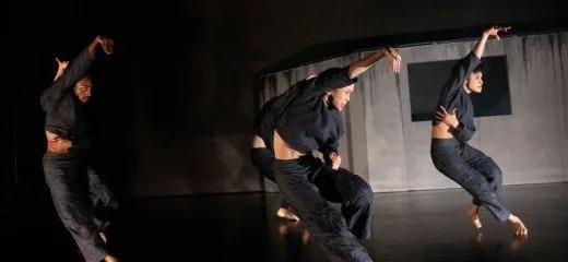 It's rare to see this kind of engagement in the realm of concert dance, even though children are often artfully included in other artistic mediums like film. The young dancers achieve a cohesive aesthetic with their relaxed feet, sweeping arms, and swirling spatial patterns. The section ends with a lighting shift and musical build as two dancers stride upstage toward the third. They seem domineering, but the lights go out before we can get in on the action.