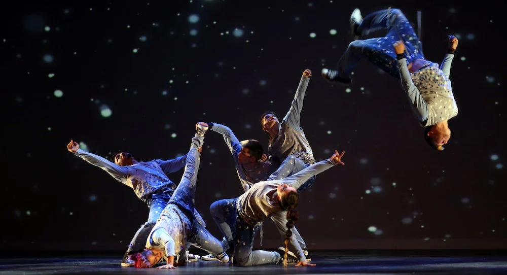 A violinist enters and starts playing a virtuosic solo against a projected nighttime backdrop. A beat comes in behind the violin and dancers soon follow. Duets inspired by secret handshakes and creative scarf-ography fill the stage –– this must be the party scene. The choreography features a mixture of complex and simple movement that’s tastefully understated and musical. The performers’ facial expressions feel genuine, and they all wear black, white and gray street clothes.